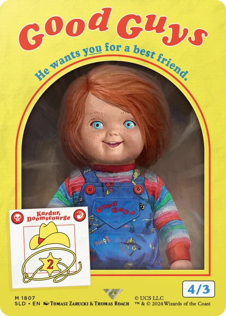 Whelp . . . we got a new Good Guys doll delivered, and it came with this strange amulet and ancient tome. So obviously we started reading the tome aloud and when we turned around the doll was gone! Weird, right? Now we keep hearing the pitter-patter of small feet echoing all around the Secret Lair . . . but it’s probably nothing. Inspired by the whole experience, we’ve made five killer cards that are all dolled up with Chucky and absolutely must be possessed. Wanna play?